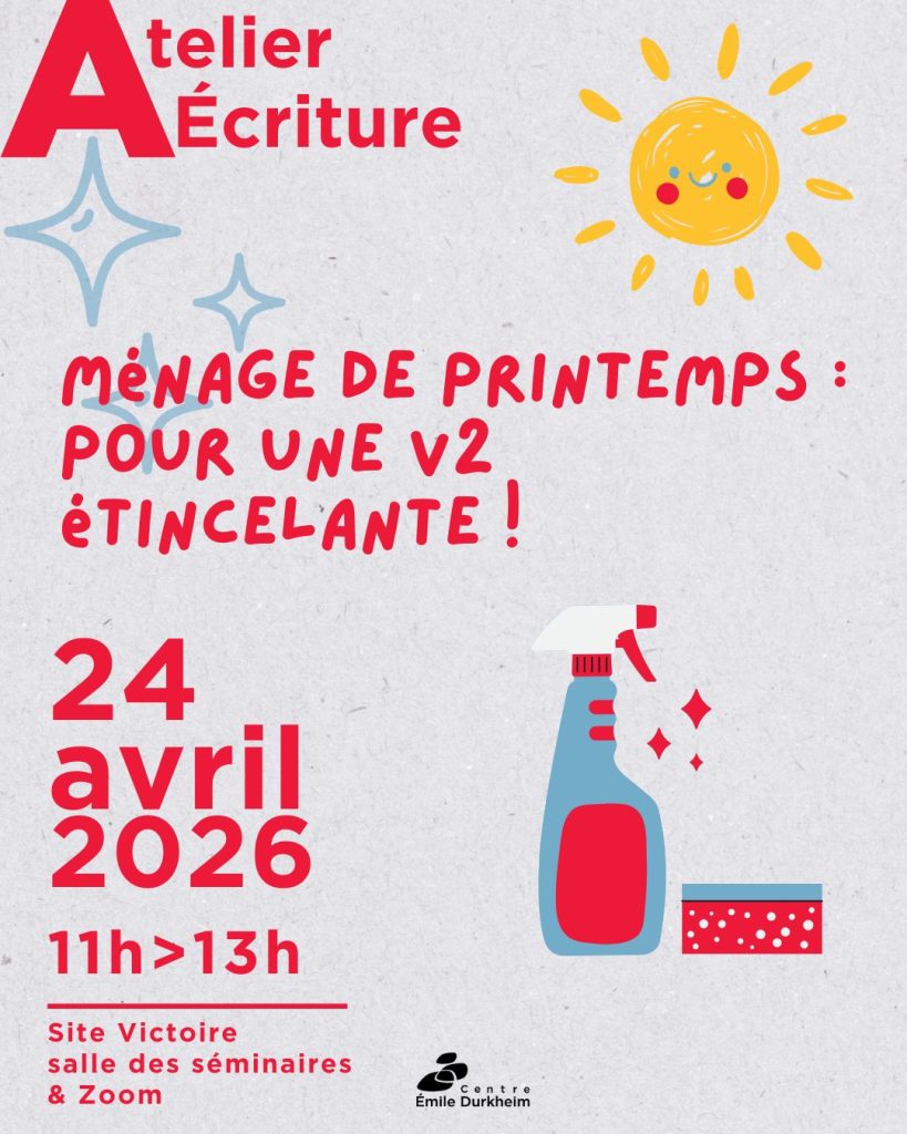 Les beaux jours sont là, c’est l'heure du ménage de printemps ! Le 24 avril, viens à l'atelier écriture pour ressortir ta V1 qui traînait dans tes dossiers, et repartir avec une V2 étincelante et prête à être publiée ! Dans cette séance, nous étudierons les bonnes stratégies pour passer de ta morne V1 à une V2 dépoussiérée : comprendre et gérer les reviews, y répondre (et comment), argumenter ses choix et maximiser ses chances de publication.